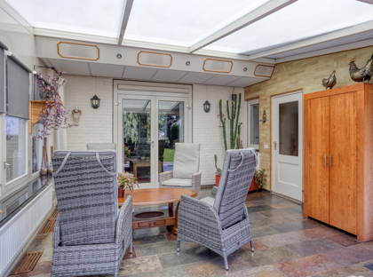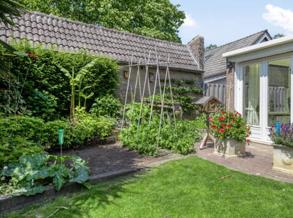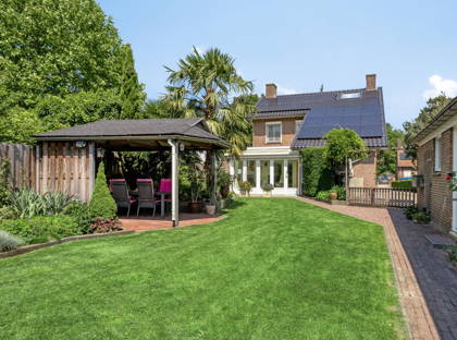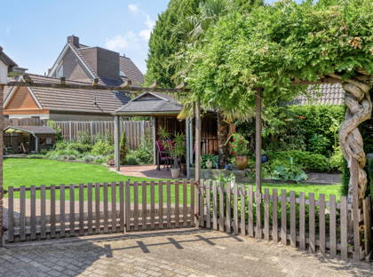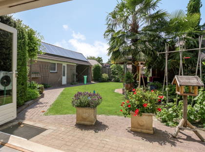 • Fraaie en zeer goed onderhouden groene tuin met terras onder overkapping en beregeningsinstallatie