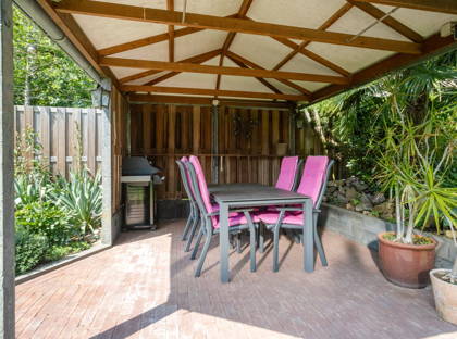 Buiten is het genieten. De tuin is mooi groen en verzorgd, met een gezellig terras onder een overkapping. De planten water geven is zo gebeurd dankzij de aanwezige beregeningsinstallatie. Aan bergruimte geen gebrek met de vrijstaande garage met krachtstroom en de aangebouwde overkapping. Je auto parkeer je trouwens met gemak op de diepe oprit, waar meerdere voertuigen kunnen staan.