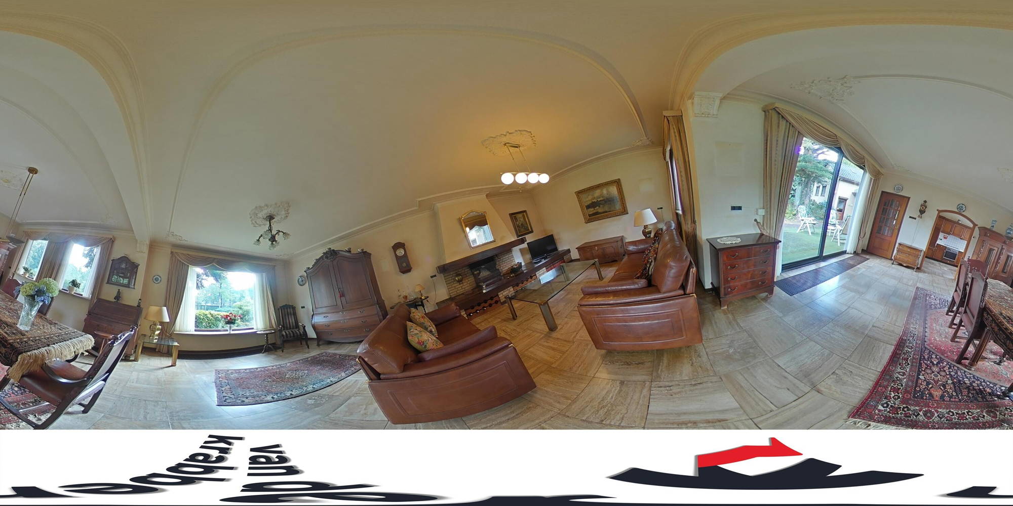 + De woonkamer heeft een ruimtelijk en licht karakter. Grote vensters laten het licht vanaf drie zijden rijkelijk binnen. Het stucwerkplafond met sierlijsten, spachtelputz wanden en de travertinvloer zorgen voor een stijlvol geheel. In een muur van schoonmetselwerk is een haard geïntegreerd. Een schuifpui geeft een doorgang naar de achtertuin.