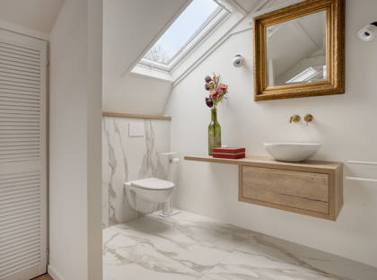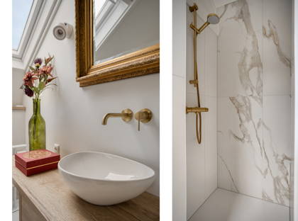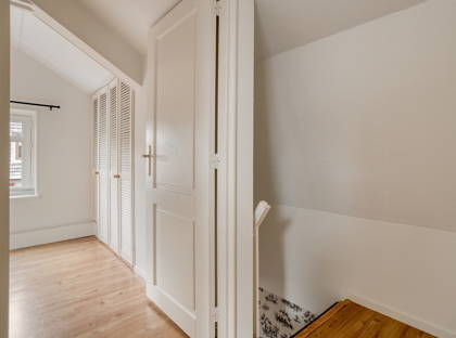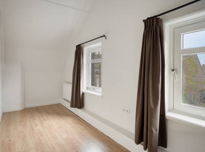 Op de eerste verdieping wordt de woning opnieuw verrassend. Hier treffen we twee comfortabele slaapkamers. Eén slaapkamer beschikt over een badkamer ensuite, welke in 2024 volledig vernieuwd is. De verdieping is voorzien van een houten vloer, diverse inbouwkasten (met automatische verlichting) en brede raampartijen met draai-kiep systeem en rolluiken voor extra comfort. Daarnaast beschikt deze slaapkamer over een VELUX dakraam en airconditioning.