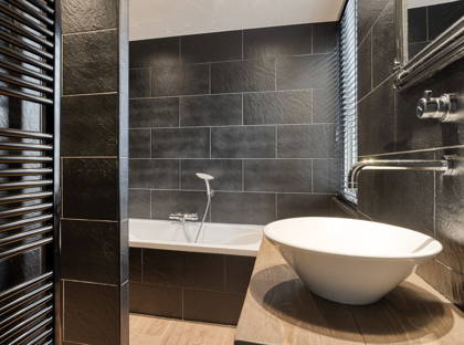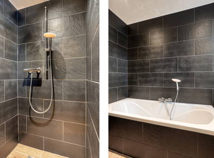 Op de begane grond bevindt zich daarnaast een volwaardige badkamer, ingericht met een douche, ligbad en vaste wastafel. Ook vind je op de begane grond een ruim slaapvertrek, waarmee de woning een levensloopbestendig karakter krijgt, ideaal voor bijvoorbeeld een gelijkvloers hoofdvertrek of thuiskantoor.