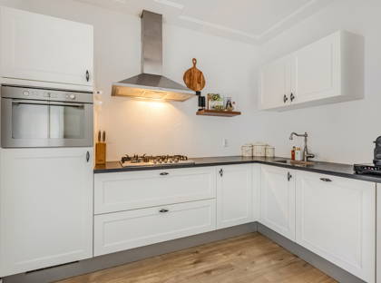Binnenkomst in de grote, lichte woonkamer met open keuken voelt direct als thuiskomen. De moderne keuken is een echte eyecatcher en volledig uitgerust met een magnetron-combi, vaatwasser, koelkast, 5-pits gaskookplaat en afzuigkap. Dankzij de royale opzet is hier alle ruimte voor een fijne zit- en eethoek.