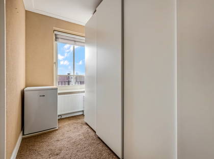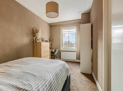 Aan de rustige achterzijde liggen twee verzorgde slaapkamers, afgewerkt met tapijt, spachtelputz wanden en gestuucte plafonds met sierlijsten, wat zorgt voor een warme en nette uitstraling.