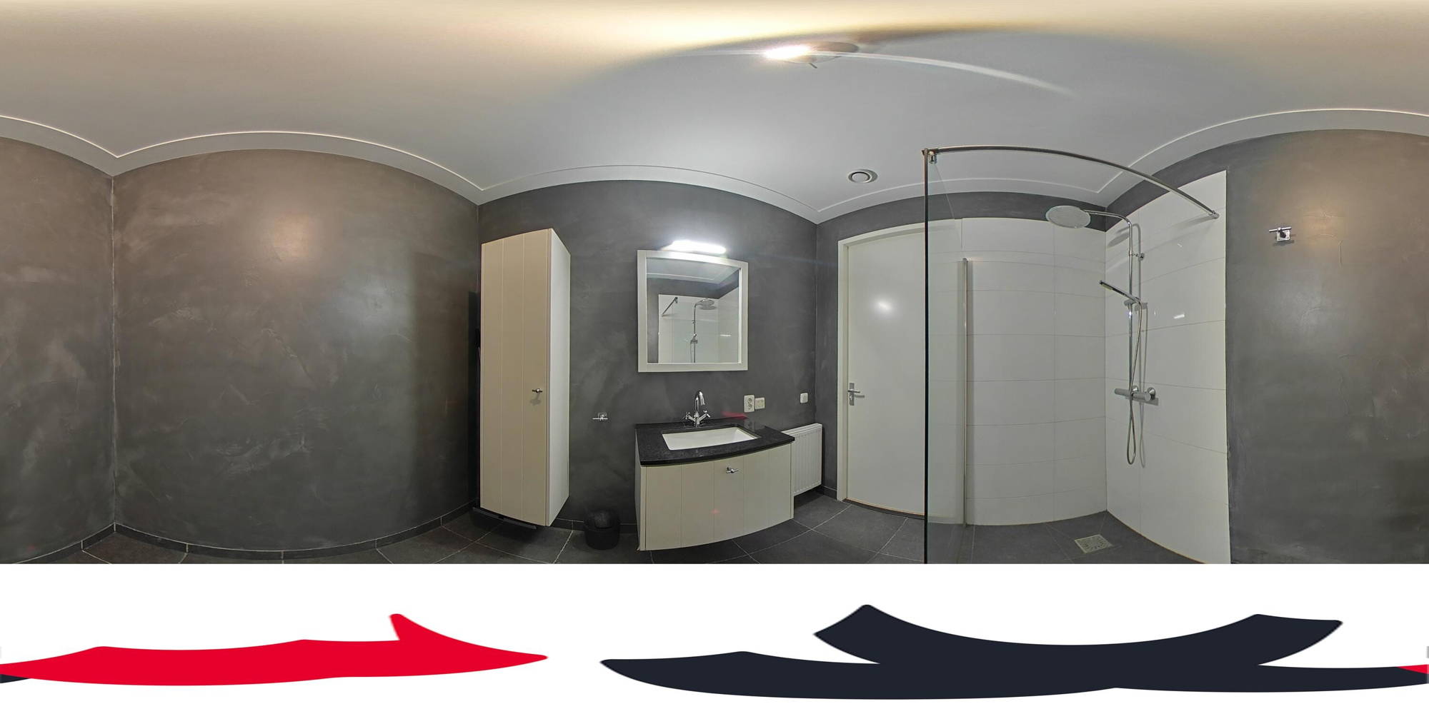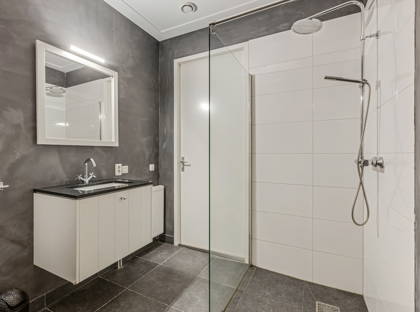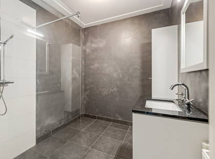 De luxe badkamer is afgewerkt met modern tegelwerk en beton ciré wanden en voorzien van een ruime inloopdouche en stijlvol wastafelmeubel. Daarnaast is er een separate toiletruimte, eveneens keurig uitgevoerd.