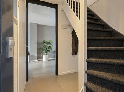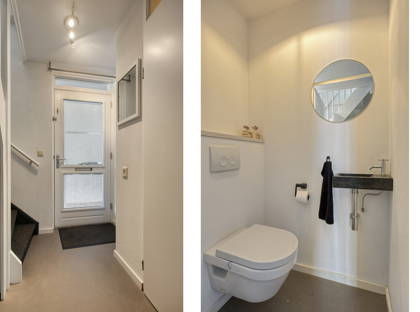 + De oprit leidt naar de voordeur onder de carport in de zijgevel. Binnenkomst in de hal met garderobe-nis, meterkast, trap en moderne toiletruimte met wandtoilet en fonteintje. Staal-met-glas-tussendeur geeft toegang tot de woonruimte.