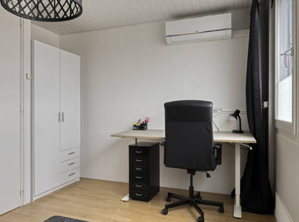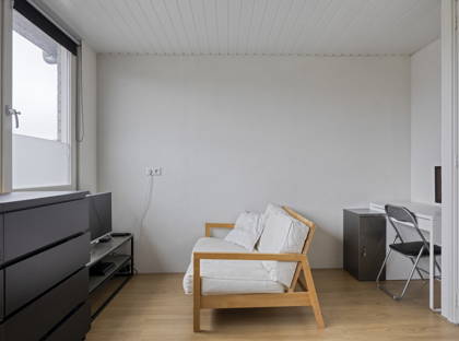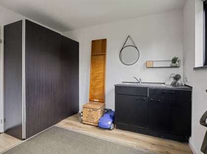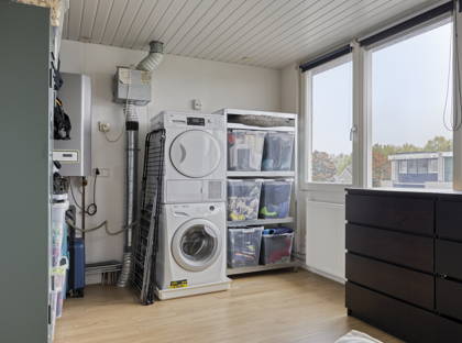 + In de andere kamer is ruim plaats voor een zitje of werk- of slaapplek. Hier bevinden zich ook de aansluitingen de wasmachine en droger. Verder zijn hier de HR-combiketel en de unit van de centrale afzuiging geïnstalleerd.