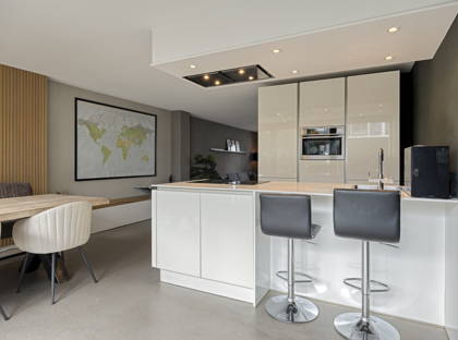 + Centraal in het luxe kookgedeelte staat een groot kookschiereiland met aansluitende bar. Tegen een wand is een keukenmeubel geplaatst. De keuken is voorzien van moderne inbouwapparatuur. In een koof boven het eiland is de afzuigkap en spotverlichting geïntegreerd.