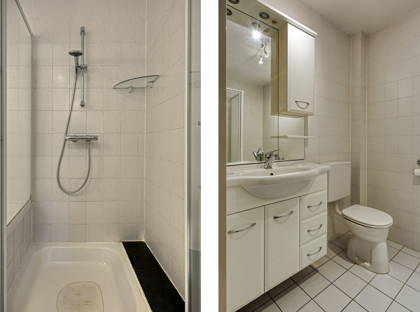+ De badkamer is geheel betegeld en uitgevoerd met centrale ventilatie, een ligbad, douchecabine, radiator, toilet en uitgebreid badkamermeubel.