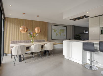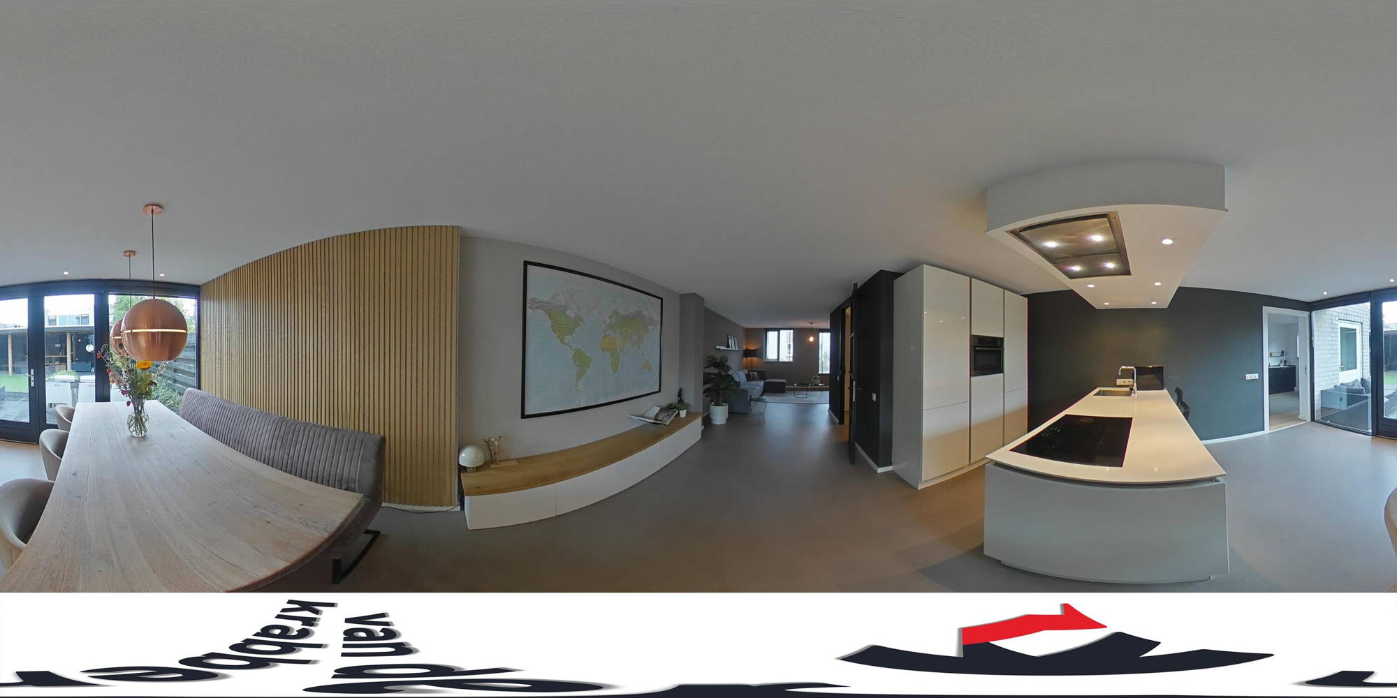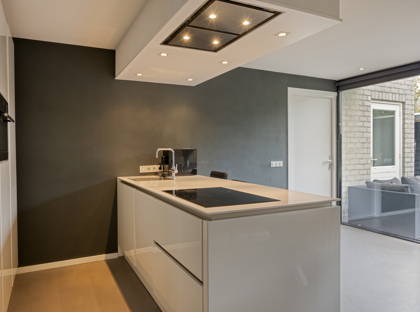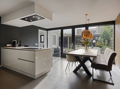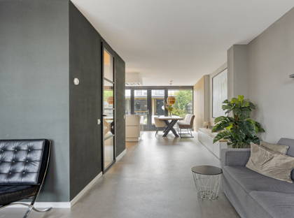 Binnen in de woning valt direct de stijlvolle, lichte uitstraling op. De woonkamer heeft ramen aan drie zijden en loopt aan de achterzijde over in de uitgebouwde leefkeuken (2017). Hier kom je echt in het kloppende hart van dit huis: een stijlvolle, tuingerichte ruimte met luxe kookeiland, bar en moderne apparatuur. Via de openslaande deuren in de glasgevel is er een vloeiende doorgang naar de zonnige tuin. Waar je onder de brede overkapping achterin nog een heerlijk beschutte plek vindt.