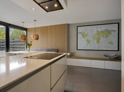 + In de uitgebouwde leefkeuken (2017) zorgt een glasgevel voor een rijkelijke lichtinval en een fraaie uitkijk in de tuin. Openslaande deuren in de glasgevel geven een fijne verbinding met het terras bij de woning.