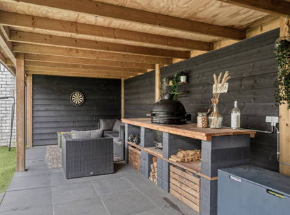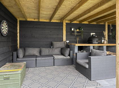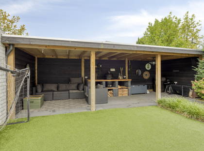 + Achtertuin biedt door de ligging op het zuiden veel zonuren. De tuin is ingericht met verharde terrassen, een kunstgazon, perken en borders. Achter in de tuin is boven een verhard terras een zeer royale overkapping geplaatst.