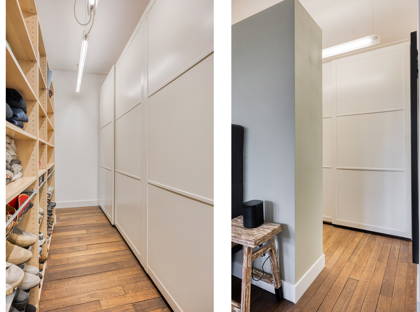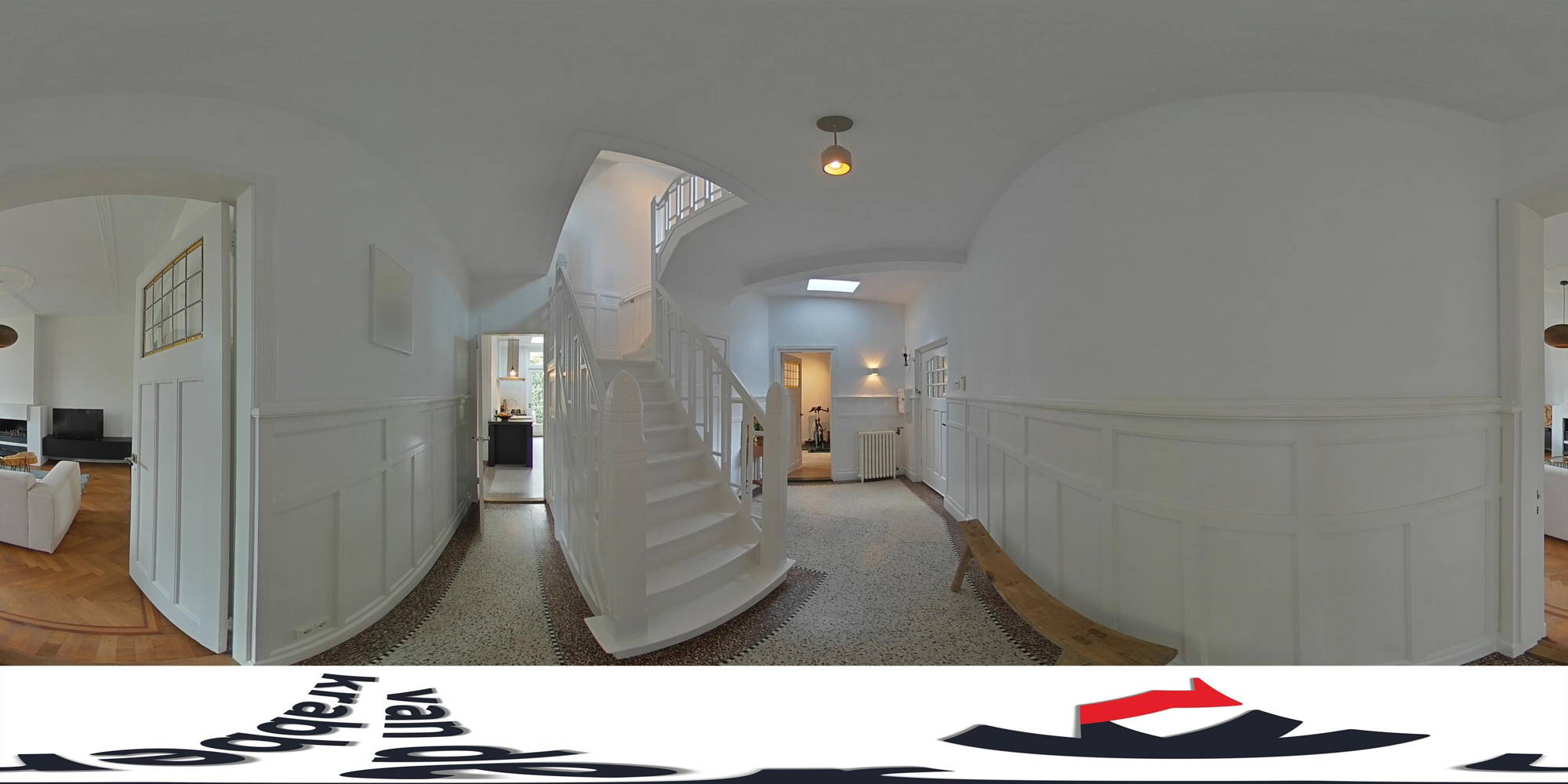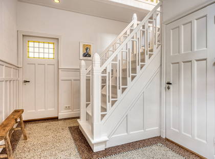 De entree vormt het centrale hart van de woning en geeft toegang tot de living, keuken, toiletruimte en de voormalige garage. De hal is ruim en stijlvol met een originele terrazzo vloer en een statige trap als blikvanger. De extra ruimte van de voormalige garage is multifunctioneel en kan uitstekend worden gebruikt als kantoor, praktijkruimte of atelier.
