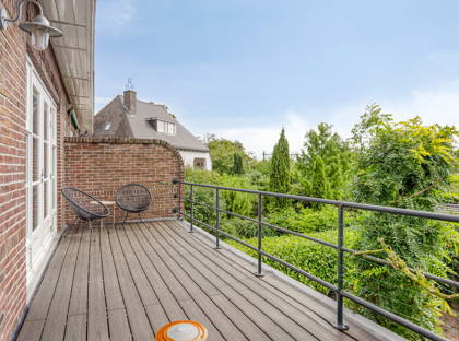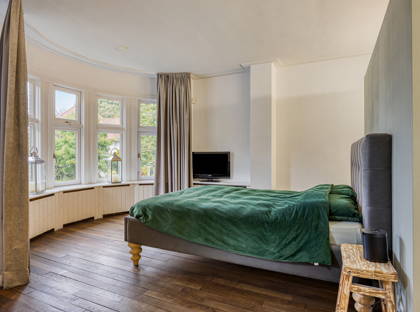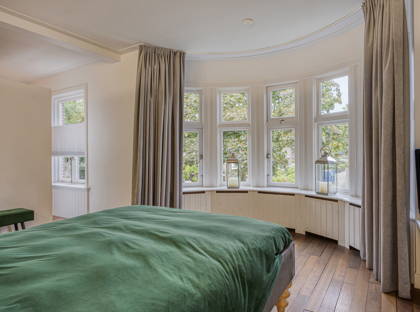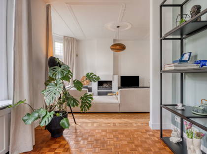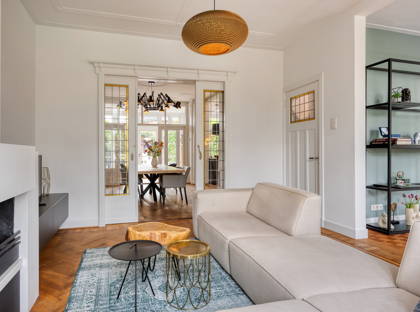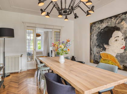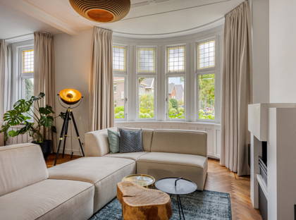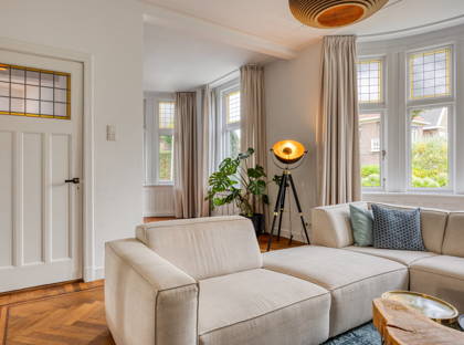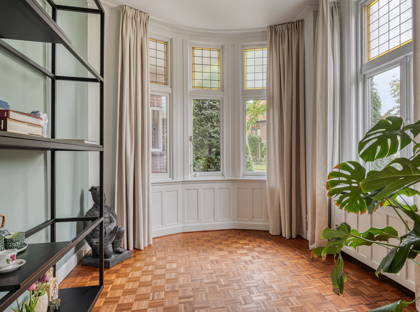 De living is bijzonder royaal en licht. Grote raampartijen, de erkers met uitzicht op de Burgemeester van den Elzenlaan en de serre aan de achterzijde zorgen voor een overvloed aan daglicht. Het hoge plafond, de fraaie afwerking met stucwerkplafonds en sierlijsten en de visgraat gelegde parketvloer maken dit tot een echte eyecatcher. Vanuit de serre heb je fraai zicht op de stadstuin.