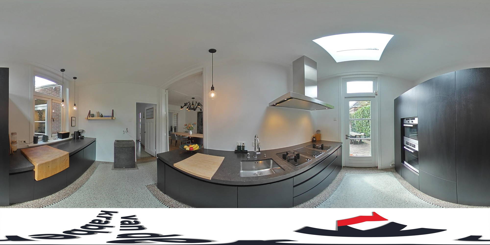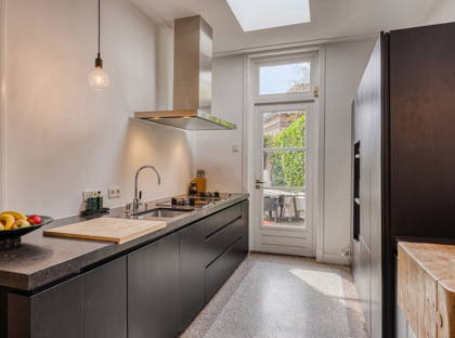 Aan de achterzijde bevindt zich de keuken, in stijl volledig gemoderniseerd maar met behoud van klassieke details zoals de terrazzo vloer en het Belgisch hardstenen werkblad. De keuken is voorzien van moderne inbouwapparatuur zoals een vaatwasser, oven, combimagnetron, koelkast, vriezer, keramische kookplaat, gasfornuis en afzuigkap. Vanuit hier is ook de stahoogte kelder bereikbaar, ideaal als provisieruimte of wijnkelder.
