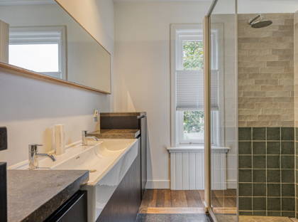+ Drie badkamers, waarvan één en-suite, met hardstenen bladen en vloeren