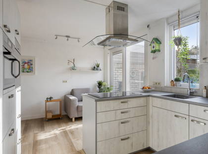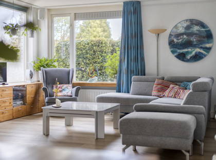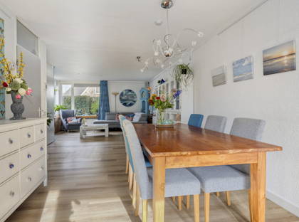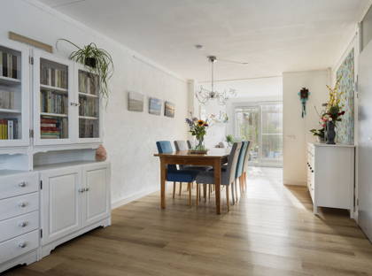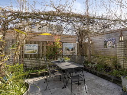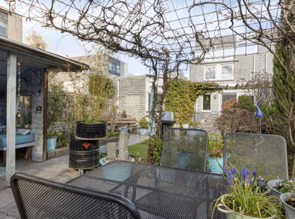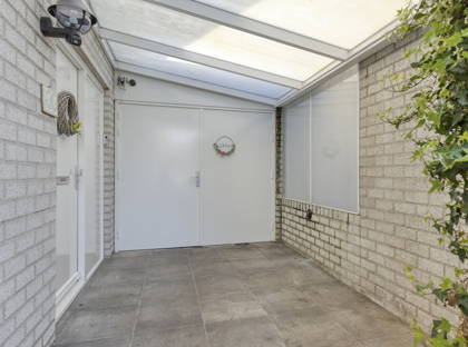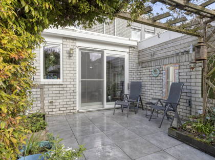 Vanuit de woonkamer schuif je de schuifpui open en stap je in de tuin: een gezellige groene oase. Het gazon, de boompjes en de kleurrijke plantjes en bloemen maken het een ontzettend sfeervol geheel. De overkapping en het schuurtje achter in de tuin maken dit plaatje helemaal compleet. Hier kun je écht even helemaal tot rust komen. De achterom is via de bijkeuken.
