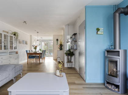 + Lichte leefruimte met sfeervolle houtkachel.