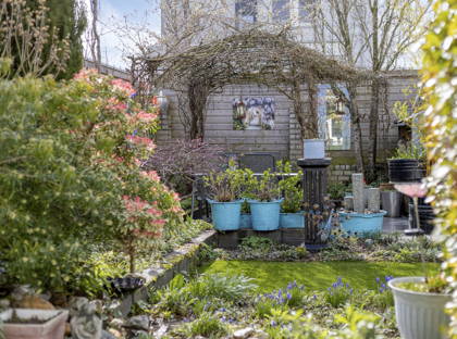 + De tuin is een sfeervolle groene oase door het gazon, de boompjes en de kleurrijke plantjes en bloemen.