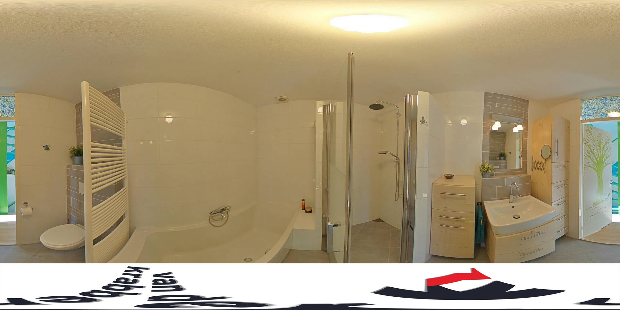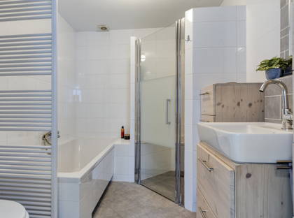 + Badkamer met ligbad, ruime inloopdouche, wastafel en toilet.