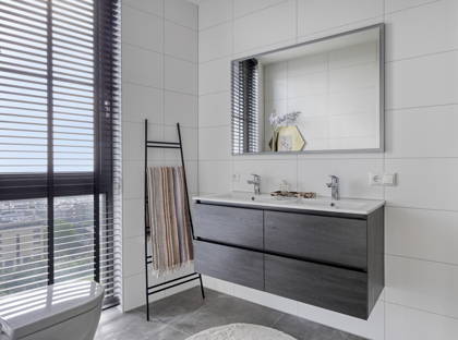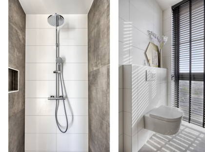 + De en-suitebadkamer is uitgevoerd met een inloopdouche met hand- en regendouche, wandtoilet en badkamermeubel met twee wastafels.