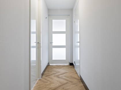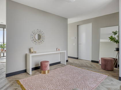 + Via de voordeur op de vijftiende etage binnenkomst in een L-vormige hal. Deze heeft aan weerszijden de toegangsdeuren van de verschillende leefruimtes en komt uit bij het woongedeelte.