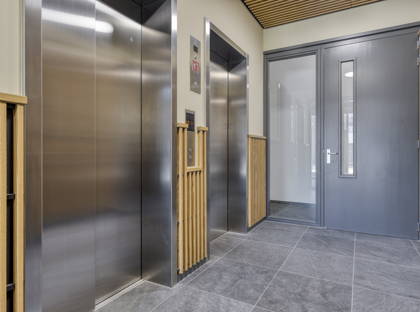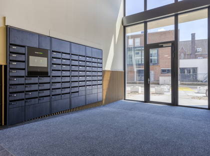 + Met videofoon beveiligde toegang tot een ruime centrale entree. Hier is een speciaal Bringme-systeem geplaatst voor pakket- en postbezorging met bediening via de app. Door een glazen schuifdeur is er vervolgens toegang tot tussenportaal met lift en trapopgang.
