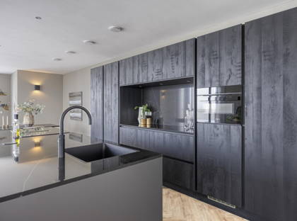 + In het luxe kookgedeelte staat centraal een groot kookeiland met natuurstenen werkblad. Het eiland is voorzien van een inductiekookplaat met werkbladafzuiging, Quooker-kraan, vaatwasser en brede keukenlades. De keukenwand bevat verder een combi-oven en een hoge koelkast.