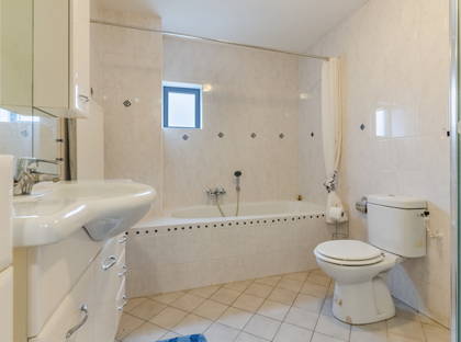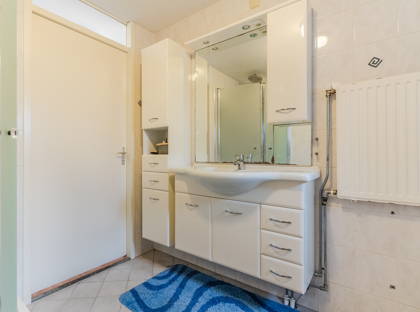 + De volledig betegelde badkamer is compleet ingericht met een toilet, badkamermeubel met wastafel, ligbad, separate douchecabine met regendouche en raam voor ventilatie en daglicht.