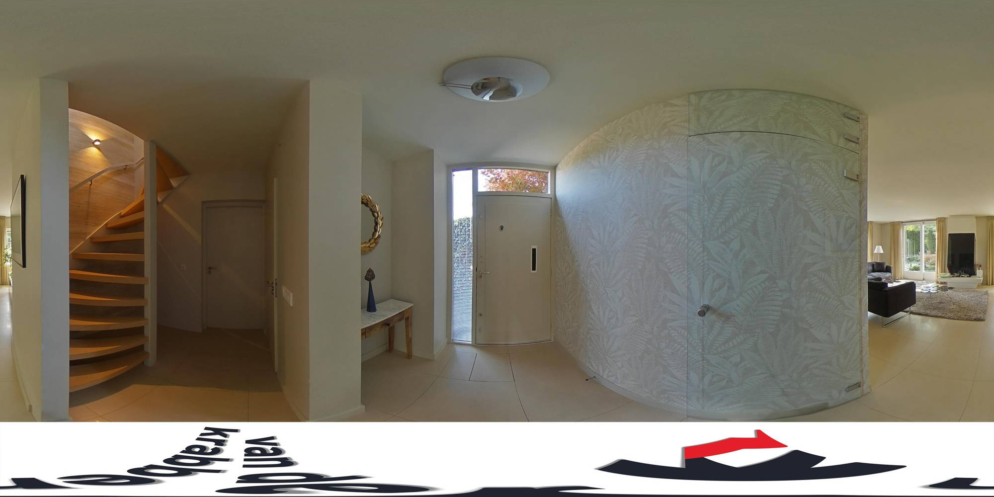+ Binnenkomst in de hal met de garderobe-nis, trap en moderne toiletruimte. De toiletruimte bevat een hoog geplaatst klapraam, luxe douchetoilet en fonteintje met wandkraan.