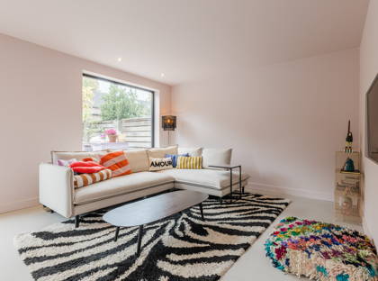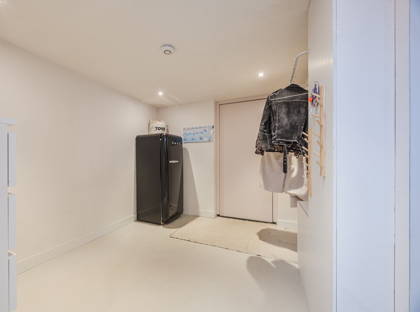 + De uitgebouwde woonkamer met leefkeuken heeft een zeer heldere uitstraling door grote vensters aan de voor- en achterzijde. De lichte tinten van de stucwerkwanden en gietvloer brengen het licht verder de ruimte in. Halverwege de woonruimte bevindt zich een bergkast (2023).