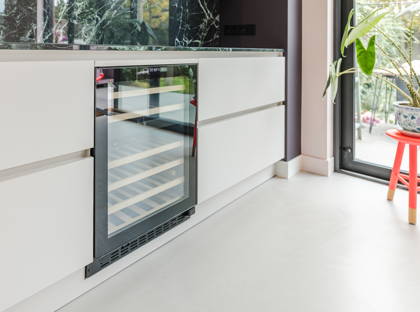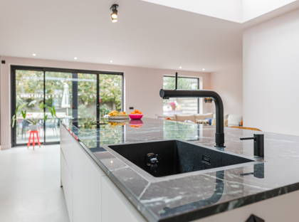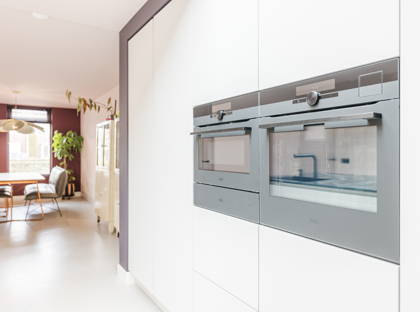 + De keuken is verder voorzien van een keranieke werkblad, Quooker-kraan met Quooker CUBE (waarmee naast kokend water ook gekoeld en bruisend water kan worden getapt en direct warm water van circa 60°C beschikbaar is in totaal vier standen: koud, bruisend, warm en kokend), Bora-inductiekookplaat met geïntegreerde werkbladafzuiging waarvan de plasmafilter minimaal 15 jaar meegaat, combi-oven, stoomoven, warmhoudlade, wijnkoeler, koelkast, vriezer en vaatwasser.