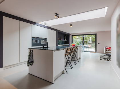 + De riante leefkeuken is ruimtelijk en tuingericht. Het licht komt hier volop binnen via een lichtstraat, brede schuifpui en een wandhoog venster. Er is ruim plaats voor een grote eettafel en er is een fijne verbinding met de groene achtertuin. Het stijlvolle kookgedeelte bestaat uit een uitgebreide keukenwand en een luxe kookeiland met bar.