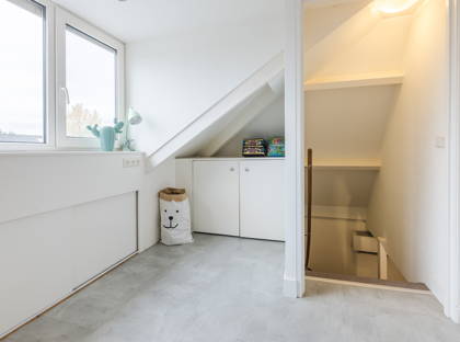 + Vaste trap naar de zolderverdieping met voorzolder en derde slaapkamer. In beide ruimtes biedt een dakkapel extra licht en ruimte. De plafonds zijn voorzien van geïntegreerde spotverlichting. Op de gehele bovenverdieping is in de schuine gedeeltes met knieschotten veel bergruimte gecreëerd. De voorzolder is daarnaast ook geschikt als extra slaapruimte, of als werk- of hobbyruimte.