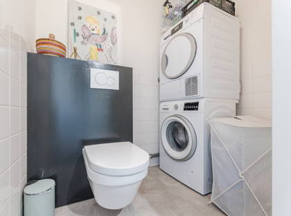 + Separate moderne toiletruimte met wandtoilet. Hier zijn ook de aansluitingen voor de wasmachine en droger.