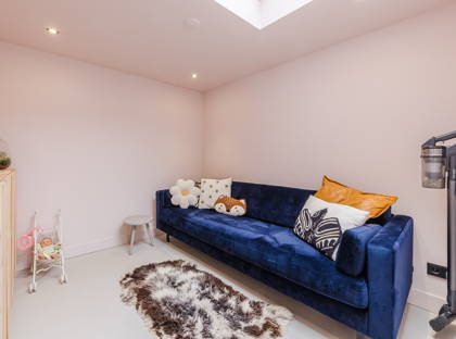 + De extra kamer heeft een lichtkoepel en een plafond met geïntegreerde spotverlichting. De ruimte is ideaal als chill-ruimte, werk- of hobbykamer.