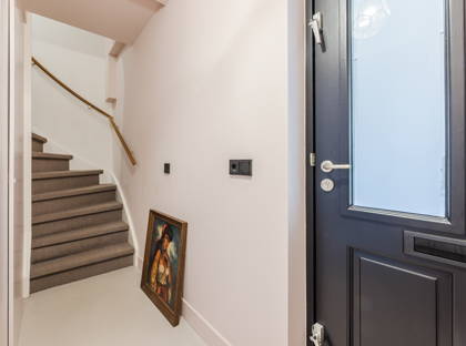 + Binnenkomst in de hal met de meterkast, trap en toiletruimte (2023). De moderne toiletruimte bevat een wandtoilet en fonteintje.