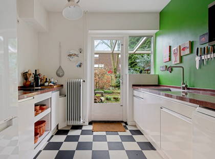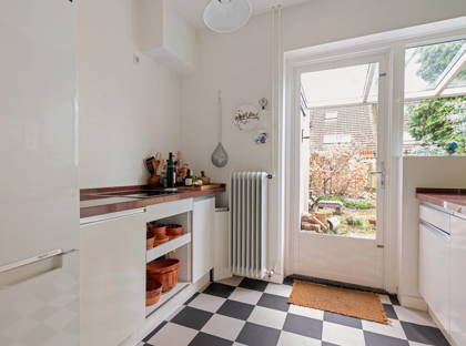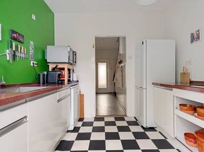 Vanuit de entree heb je ook toegang tot de karaktervolle kombuiskeuken. Met kasten en aanrechtblad aan beide zijden van de keuken, heb je lekker veel ruimte om mee te werken. De keuken is voorzien van een inductiekookplaat, koel-vriescombinatie en vaatwasser.