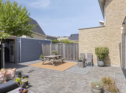 De zonnige tuin op het zuiden is onderhoudsarm aangelegd en biedt directe toegang tot de geïsoleerde berging en beide parkeerplaatsen onder de carport.