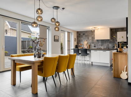 Binnen geniet je van een ruime woonkamer met vloerverwarming, een moderne leefkeuken met kookeiland en ruimte voor een royale eettafel waar het heerlijk tafelen is.