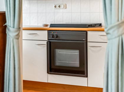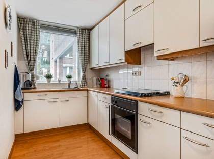 De halfopen keuken sluit aan op de woonkamer en beschikt over een 4-pits gaskookplaat en een elektrische oven. De opstelling is praktisch en biedt voldoende werk- en kastruimte. Vanuit de keuken is er toegang tot de bijkeuken.