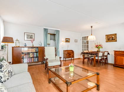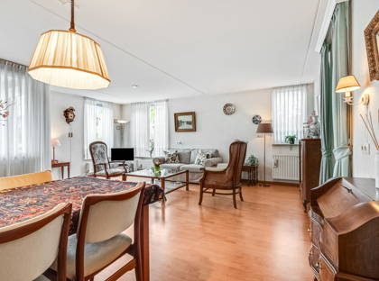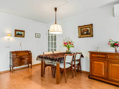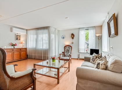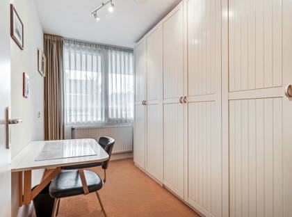 De lichte woonkamer heeft grote ramen waardoor er volop daglicht naar binnen stroomt. De laminaatvloer en spachtelputz wanden geven de ruimte een verzorgde uitstraling. Dankzij de ligging op de begane grond is er een prettig uitzicht op het groen voor de woning. Voor extra comfort is de woonkamer voorzien van screens en een airco-installatie (2023) die zorgt voor verkoeling in de zomer en extra warmte in de winter.