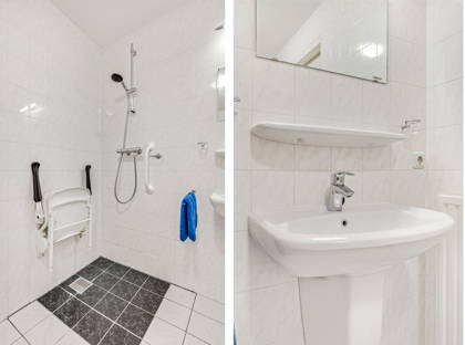 De badkamer is compleet uitgerust met een douche, ligbad en wastafel. Daarnaast is er een apart toilet.