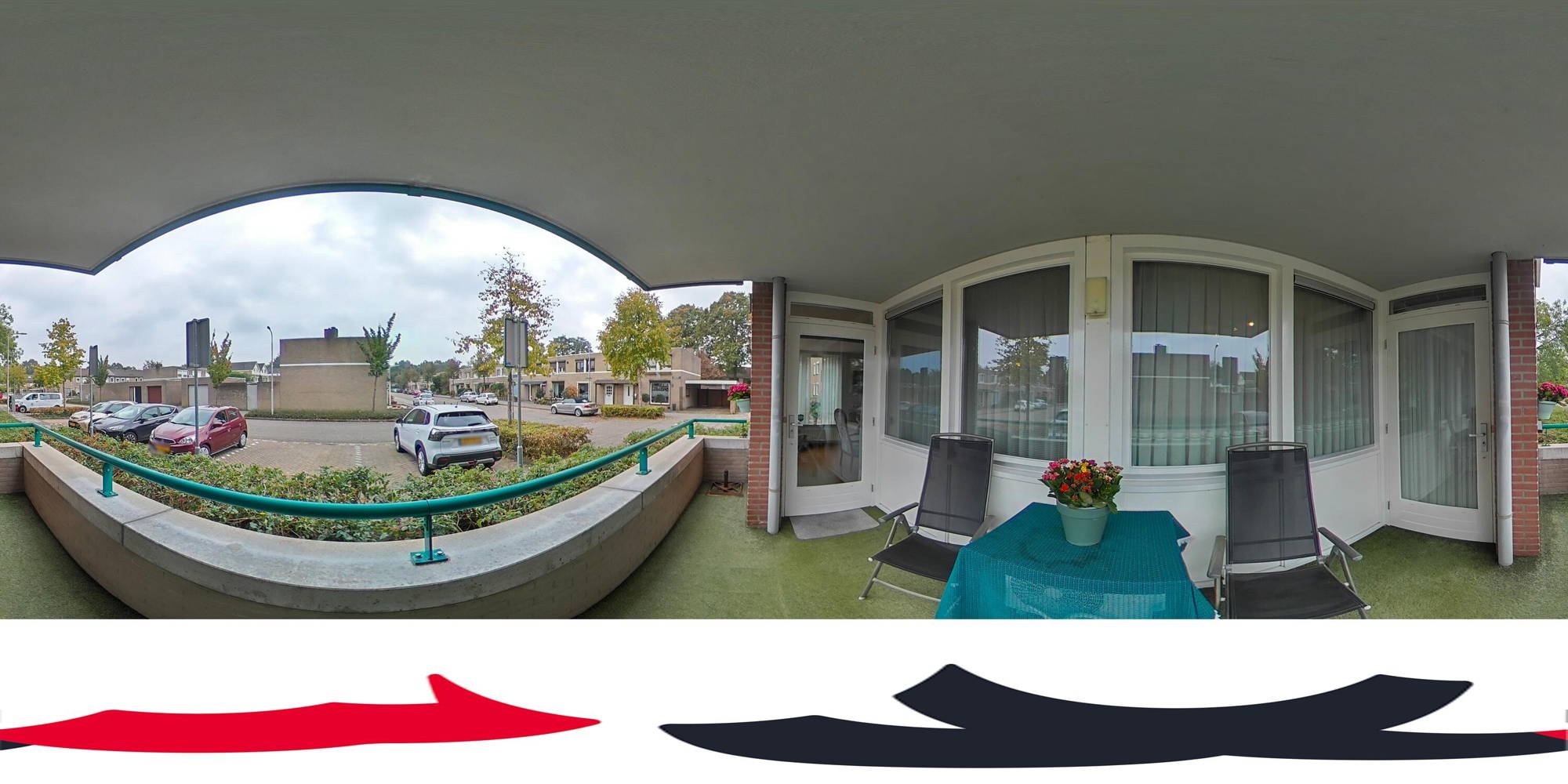 Aan de voorzijde van de woning bevindt zich het overkapte balkon, gelegen op het zuiden. Door de ligging en beschutting is dit een heerlijke plek om buiten te zitten, met uitzicht op het groene veld aan de overzijde.
