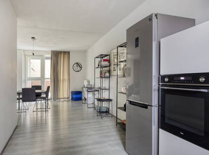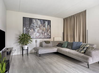 + De Z-vormige woonkamer heeft een prettige lichtinval, lichte wanden en een strak stucwerkplafond. De balkondeur geeft een mooie doorgang naar de loggia.