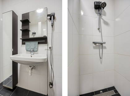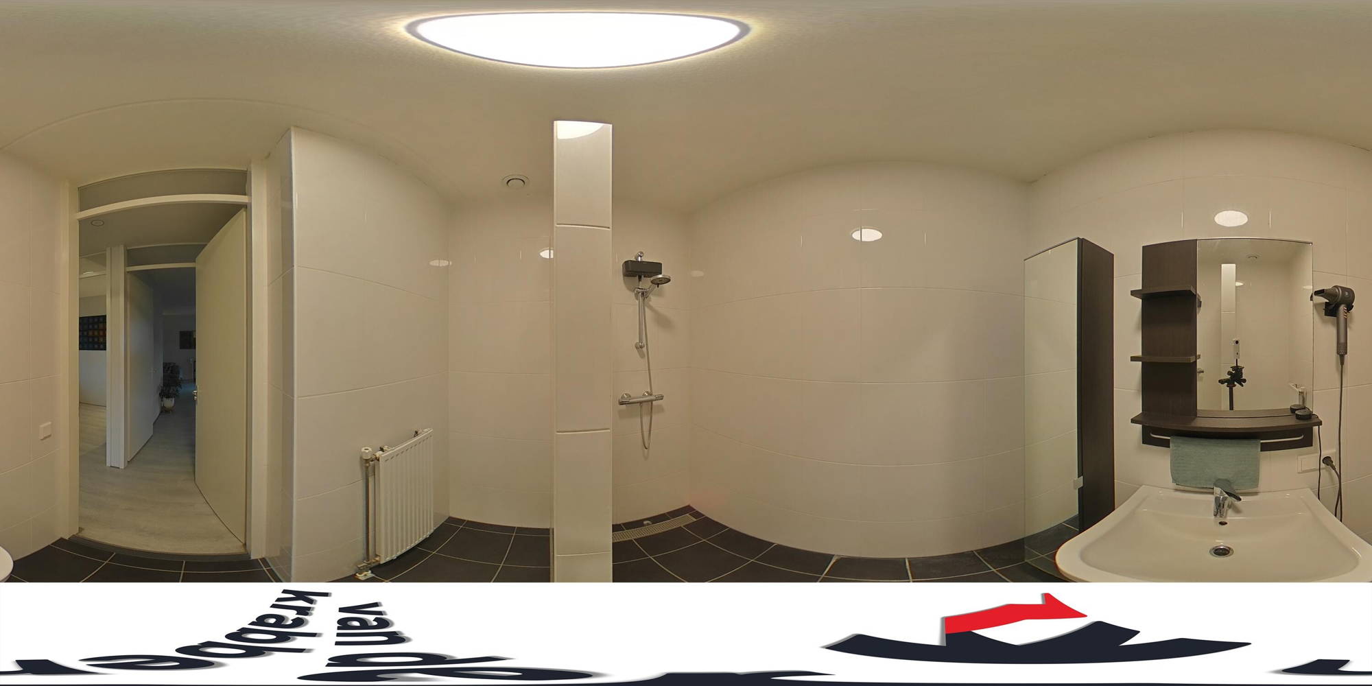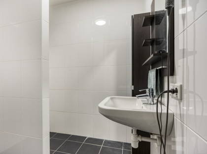 + Volledig betegelde badkamer met inloopdouche en wastafel.