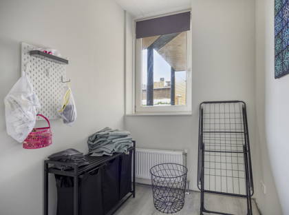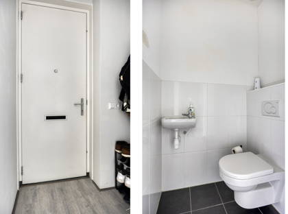 + Binnenkomst in de hal met garderobe-nis, meterkast en een nette toiletruimte met wandtoilet en fonteintje. De laminaatvloer loopt door in de rest van het appartement.