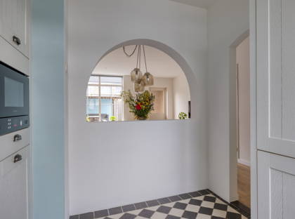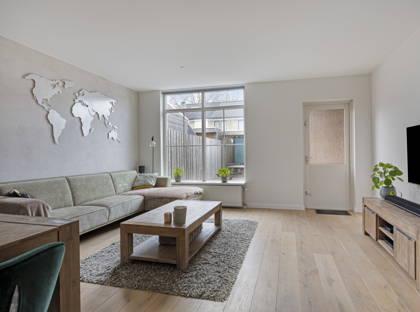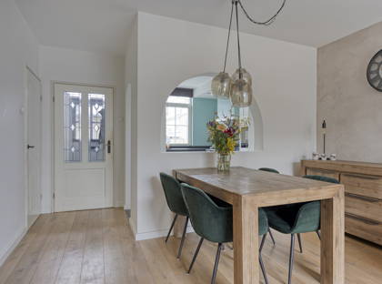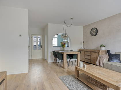 Vanuit de hal stap je via de glas-in-lood deur naar de tuingerichte woonkamer. Deze ruimte voelt warm en uitnodigend aan dankzij de parketvloer. Het strak gestucte plafond maakt de ruimte af. Grote raampartijen zorgen voor veel lichtinval en een prettige verbinding met de tuin.