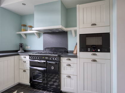 De keuken is apart gelegen en vormt een fijne plek voor kookliefhebbers. Je beschikt hier over een complete opstelling met koelkast, diepvries, oven, magnetron, vaatwasser, een 5-pits gaskookplaat behorend bij een stijlvol Falcon fornuis met natuurstenen werkblad. Praktisch én sfeervol, precies zoals je het wilt.