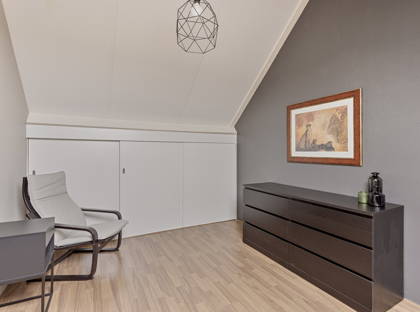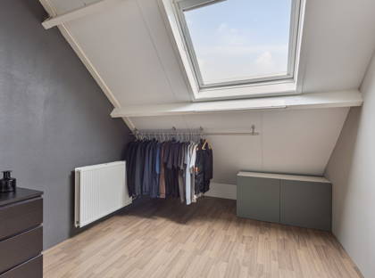 + Vaste trap naar tweede verdieping met vierde slaapkamer. Een groot dakraam zorgt hier voor een prima lichtinval. In het schuine gedeelte is veel bergruimte gecreëerd. In deze kamer hangt een radiator.