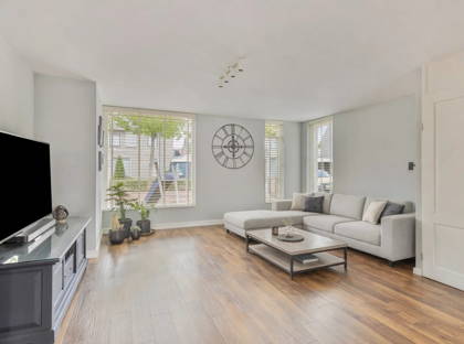 + De uitgebouwde woonkamer is ruimtelijk en heeft een lichte sfeer. In de zitkamer aan de voorzijde laten twee grote ramen en een zijvenster het licht fraai binnen. De tinten op wanden en plafond versterken het ruimtelijke, lichte karakter.